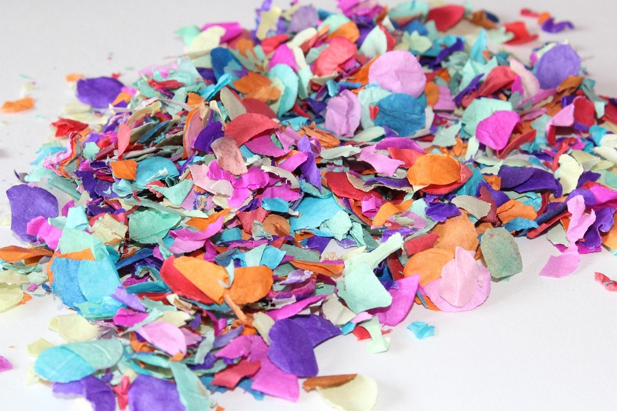 Een winkelmedewerkster is vakken aan het vullen. Ze pakt een confettikanon dat in het verkeerde schap ligt en loopt er m…